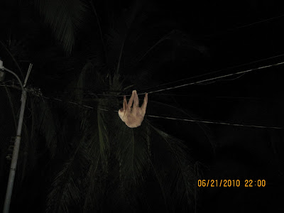 After writing the last few paragraphs yesterday evening, we decided to go for a little walk in the town. On our way back to the hotel, as we were crossing the street, I happened to look up and notice something hanging on the power line. At first I thought it was some sort of canvas bag or some kid's backpack. As I looked closer, I realized that it was a sloth. I thought that maybe someone had hung up a stuffed animal as a joke or something but as we got closer, I realized that it was a real live sloth! We watched hang for a few moments and confirmed that its head was moving a little. I had been thinking all day about how Costa Rica is a country where you need to have your camera with you at all times but of course, I had left mine at the hotel. The nice thing about a sloth is that they dont move too much so we were confident it would still be there if we ran and got the camera. We walked quickly back to the hotel hoping that there would be other people awake and hanging out so that we could invite them to come with us. There was only 1 couple still up, a French couple. Rob told them about the sloth and even though they had a difficult time understanding what was there, they grabbed their camera and the 4 of us headed back. Sure enough, the sloth hadnt moved an inch. As we stood there taking pictures, he started making his way across the power line. We were suprised at how quickly he made his way hand over hand but after going about 35 feet, he stopped to rest and didnt move again while we were there. A local guy came out when he saw us taking pictures and offered all kinds of useful information about the sloth, like that some people eat them but he doesnt because of all of the bacteria that they carry.